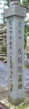 奥の院参道には、「藤之坊 成福院墓地 ビルマ方面戦没英霊納骨塔 パゴダ」と記した墓標が建てられている。