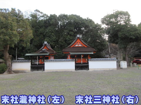 三神社の北側に隣接、鎮座する社殿で、屋根は檜皮葺、正面一間、身舎側面一間の一間社春日造である。