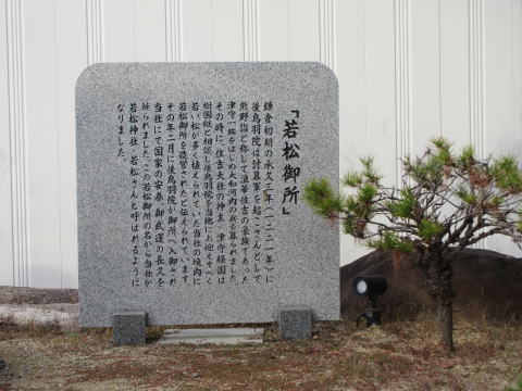 その時に住吉大社の神主 津守経国は樹国継と相談し、後鳥羽院を当地に迎えるべく、若い松が多く植えられていたこの場所に若松御所を造営したという。